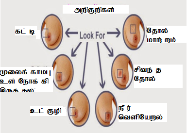 3. மர்பகதிலோ அல்லது அக்குளிலோ வீக்கம் அல்லது கட்டிகளும் படர் அடையாளங்கள் மார்பகத்திலும் முலைக்காம்புகளிலும் காணப்படல் .